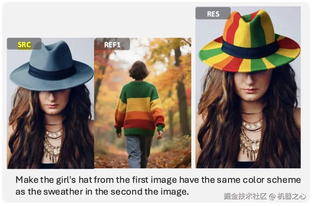 基于指令的多模态编辑:让第一张图像(源图像)中女子的帽子拥有与第二张图像(参考图像)中毛衣相同的配色方案。