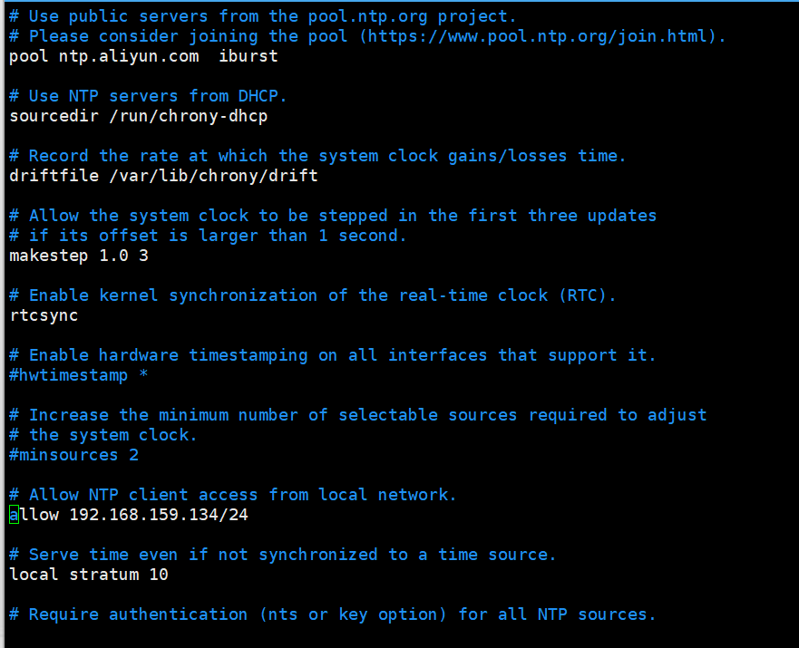 1.通过自定义时间服务器向指定的客户端主机同步时间,自定义时间服务器主机的时间通过ntp.aliyun.com主机同步时间