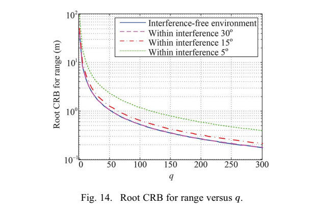 图14描述 :图14展示了距离的根CRB与整数 q q q的关系。可以观察到,随着频率增量增加,距离估计精度得到改善。然而,为了实现距离模糊解决,频率增量应小于 B / ( 2 N a ) B/(2N_a) B/(2Na)。因此,当频率增量选择为最大允许值时,可以达到最大改进。