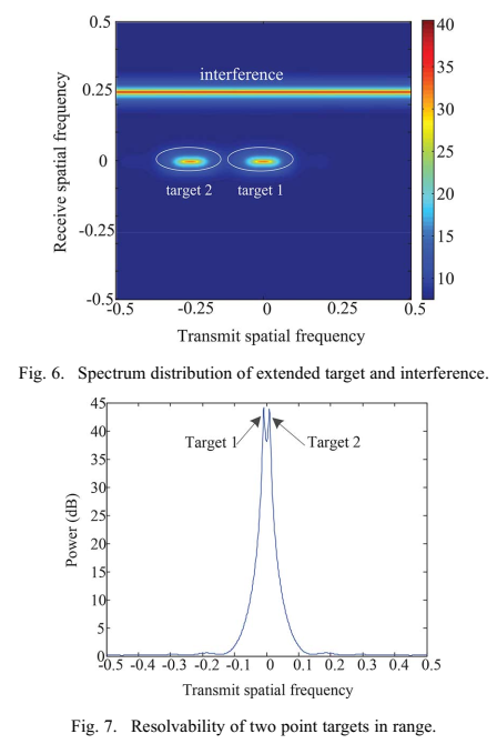 图6和图7描述:图6展示了FDA-MIMO雷达中扩展目标和干扰的频谱分布。目标频谱在发射维度扩展。由于频谱宽度受约束条件限制,这两个目标可以清晰区分。