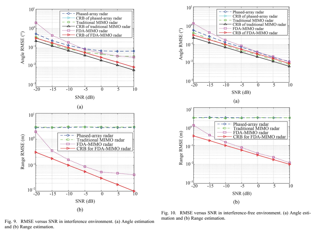 图9和图10描述:图9展示了干扰环境下RMSE随SNR的变化。可以观察到:(a)角度估计在高SNR下存在偏差;(b)FDA-MIMO雷达的距离估计精度随SNR增加显著提高,而传统MIMO雷达的精度无法改善。图10展示了无干扰环境下的结果,FDA-MIMO雷达的RMSE非常接近CRB。