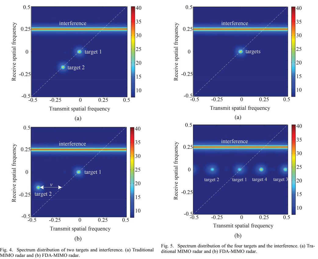 图4和图5详细描述 :图4展示了两个目标和干扰在联合发射接收空间频率域的频谱分布。第一个目标在第一模糊距离区域(主距离区域),第二个目标在第二模糊距离区域。在传统MIMO雷达中(图4a),两个目标都呈对角分布。在FDA-MIMO雷达中(图4b),第二个目标在发射空间频率域偏移了 v = 0.25 v = 0.25 v=0.25。