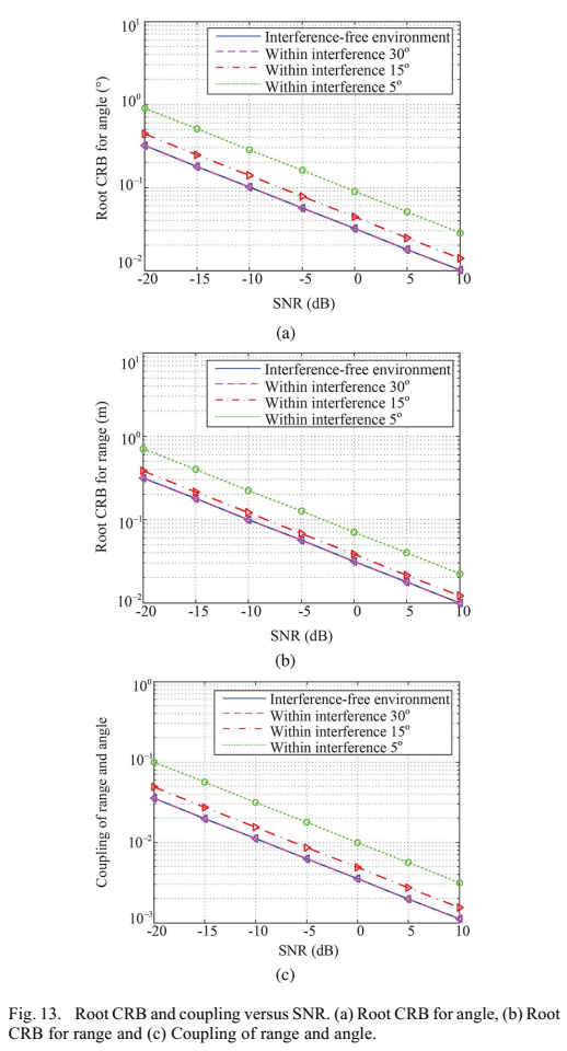图13描述 :图13展示了角度为 0 ° 0° 0°的目标的根CRB和耦合关系随SNR的变化。(a)角度的根CRB,(b)距离的根CRB,©距离和角度之间的耦合。可以看到,无干扰环境下的根CRB低于干扰环境。当干扰角度接近目标角度时,根CRB变大。距离的根CRB远小于无干扰环境下的距离分辨率(10米)。