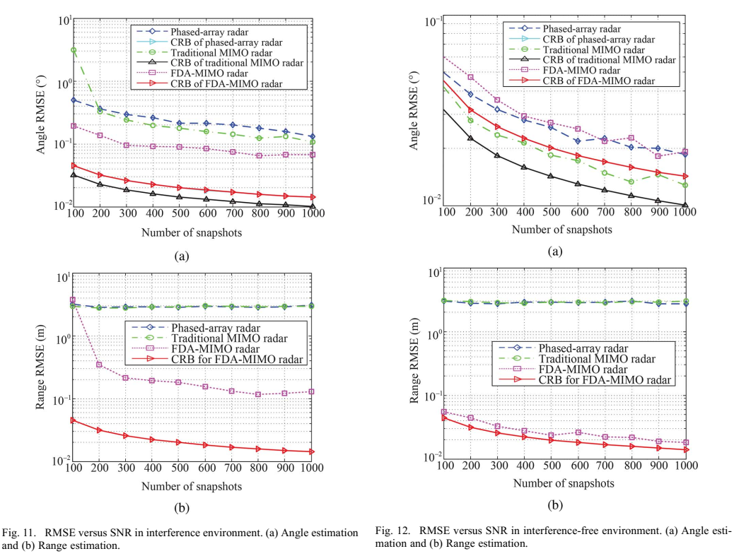 图11和图12描述:图11和图12展示了SNR = 0 dB时RMSE随快照数的变化。图11显示,在干扰环境下,FDA-MIMO雷达的距离和角度估计精度高于相控阵雷达和传统MIMO雷达。图12显示,在无干扰环境下,FDA-MIMO雷达的距离和角度RMSE非常接近CRB。