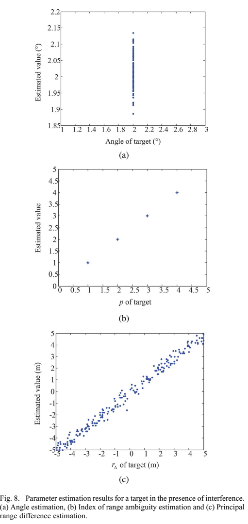 图8描述:图8展示了存在干扰时目标的参数估计结果。(a)角度估计非常接近真实值,(b)距离模糊指标的估计值完全等于真实值,©主距离差的估计值接近真实对应值。因此,使用所提方法,距离模糊得到解决,距离估计精度显著提高。