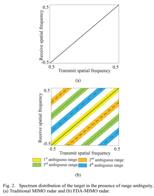 图2描述:图2展示了存在距离模糊时目标在联合发射接收空间频率域的频谱分布。(a)传统MIMO雷达中,目标频谱沿对角线分布,无法区分不同的模糊距离。(b)FDA-MIMO雷达中,经过补偿后,来自不同模糊距离的目标出现在不同的频带中,第一、第三和第四模糊距离的目标清晰可见。