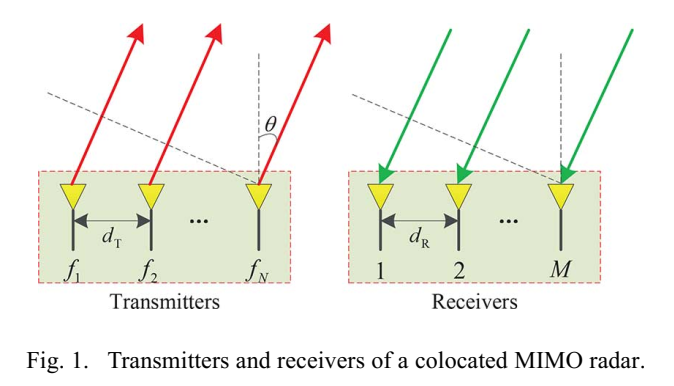 考虑一个同址MIMO雷达系统,由 N N N个发射天线和 M M M个接收天线组成。第 n n n个天线的载波频率为:
