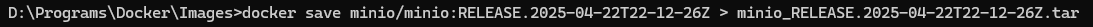 docker save minio/minio:RELEASE.2025-04-22T22-12-26Z > minio_RELEASE.2025-04-22T22-12-26Z.tar