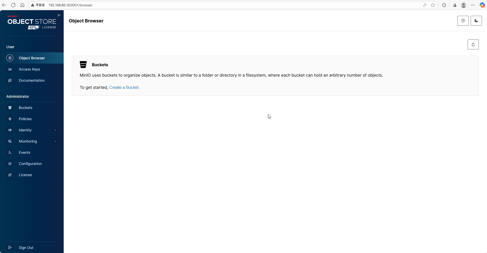 安装的,可以直接访问:http://127.0.0.1:9001,输入在 minio-compost.yaml 中配置的用户名/密码,即可登录