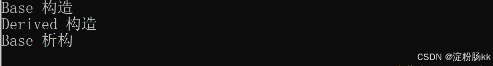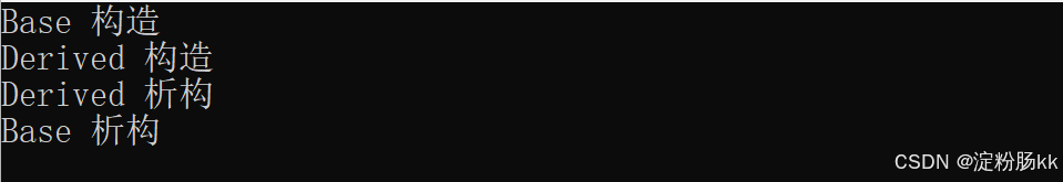 若~Base()是虚函数:满足动态多态,析构函数调用采用"动态绑定",根据动态类型Derived*,先调用~Derived()释放派生类资源,再调用~Base()释放基类资源,符合预期。运行结果: