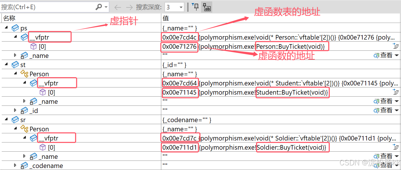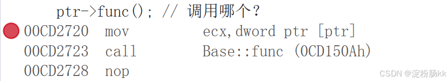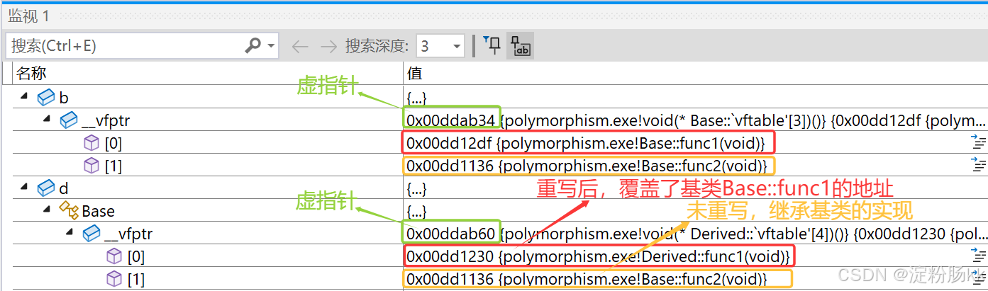 - 通过基类指针或引用调用虚函数:只有通过基类的指针或引用,才能触发运行时的函数绑定。