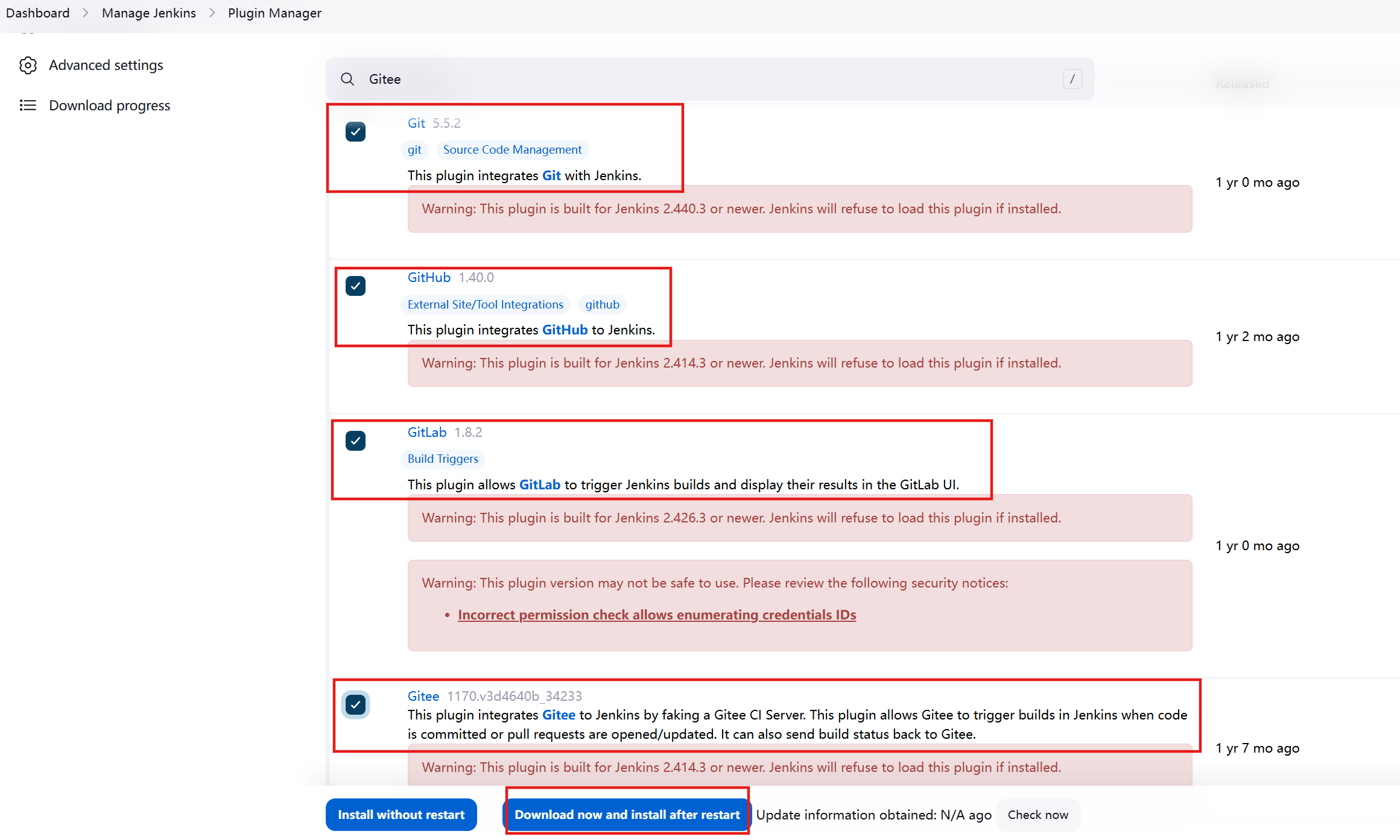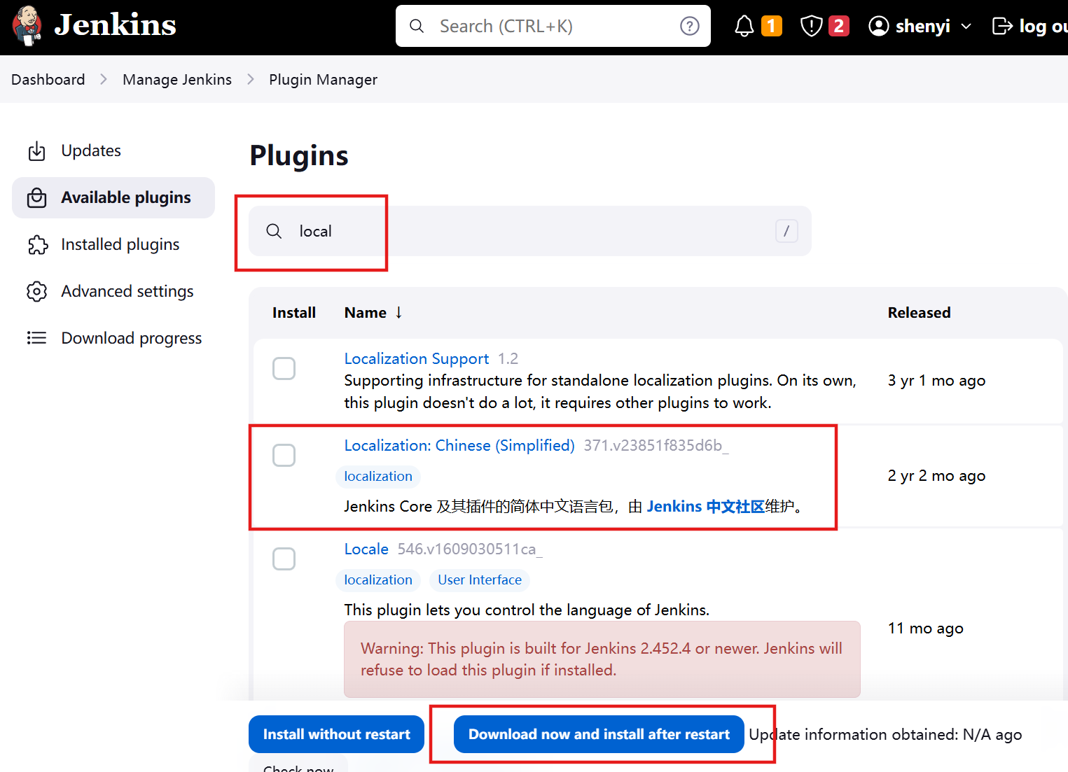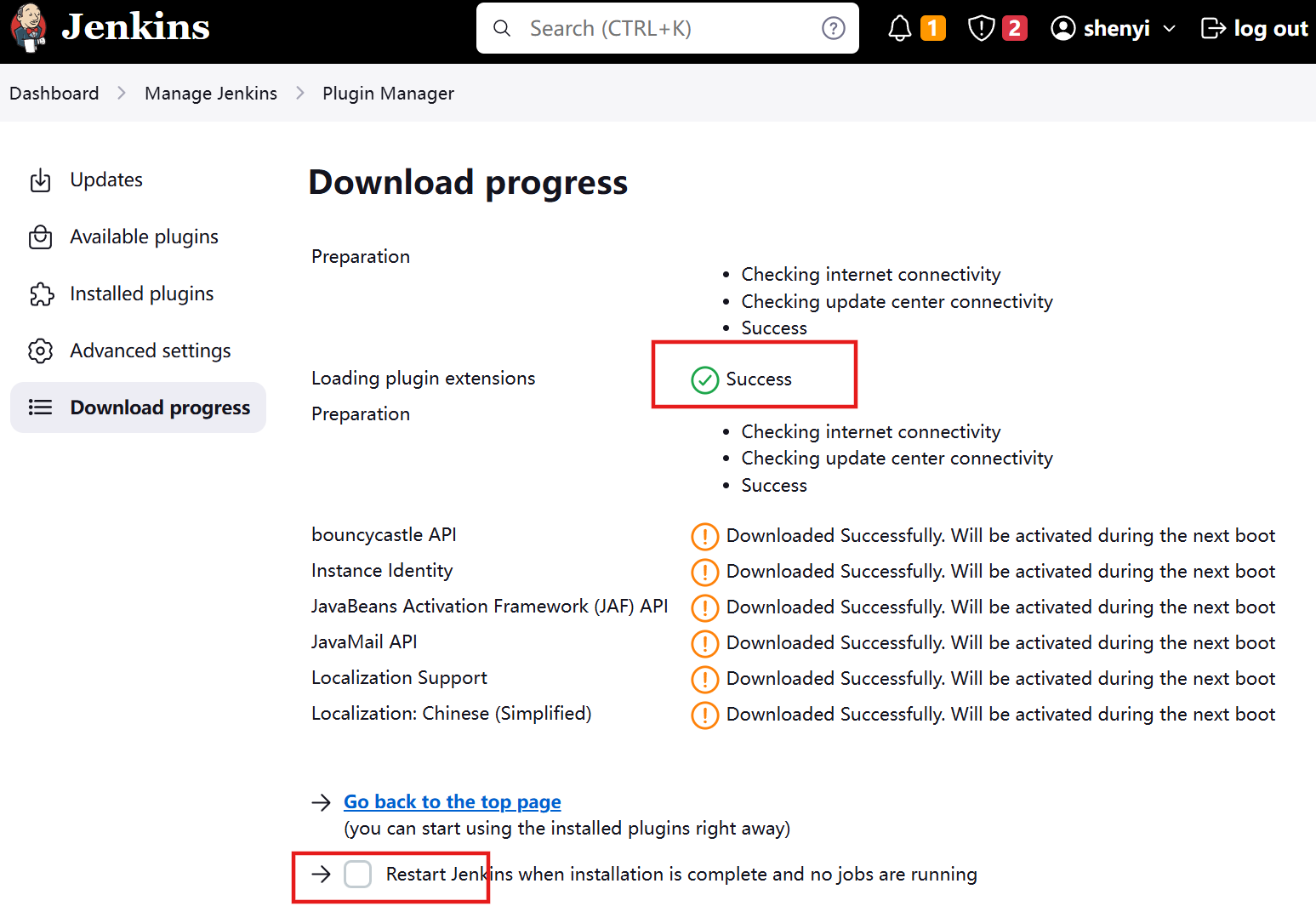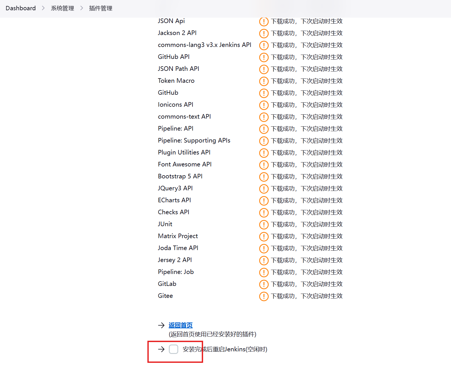 - 将 Jenkins 插件源替换为国内源(如华为云、清华大学源),安装简体中文插件及 Git、GitHub、GitLab、Gitee 等插件,安装完成后重启 Jenkins