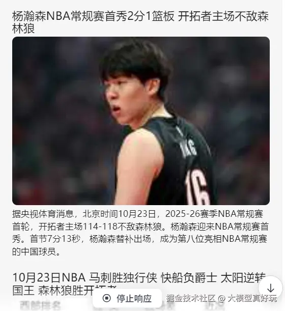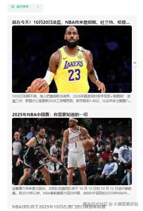 - 在智能体中测试自定义卡片,新闻列表将按照自定义的模板格式完美展示。今天也是我们中国球员杨瀚森登陆NBA的首场比赛,大家支持一下吧!更多的使用方法大家可参考coze官方教程