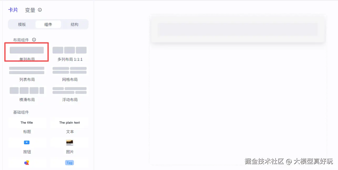 - 点击卡片,卡片中的结构面板以树状图的形式表示卡片结构,点击singlecolumn2单列结构