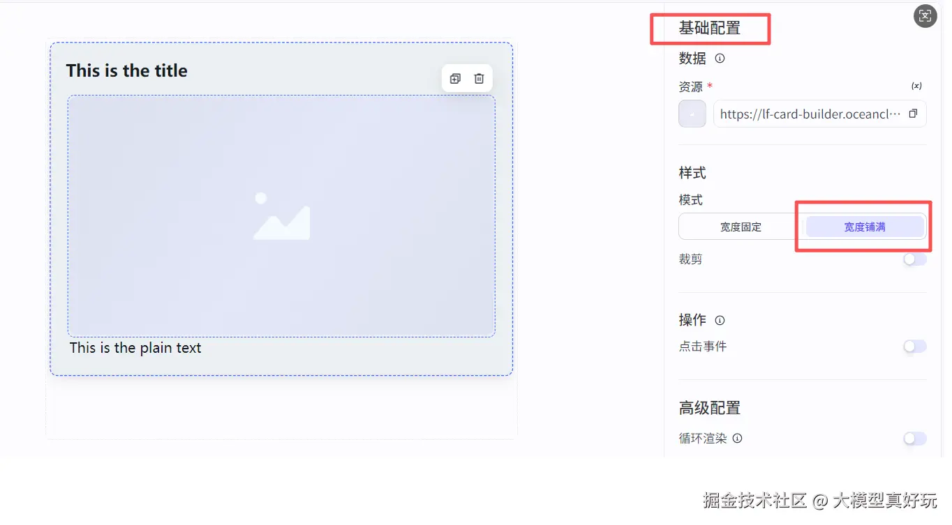 - 通过右侧基础配置面板调整样式:标题使用较大字号,摘要使用较小字号,图片设置为宽度铺满