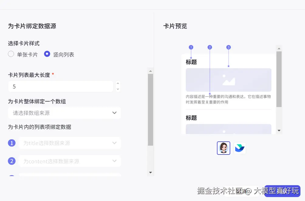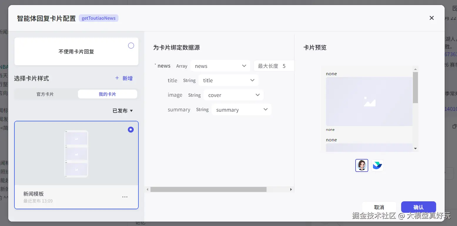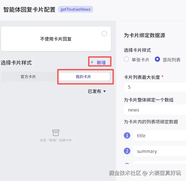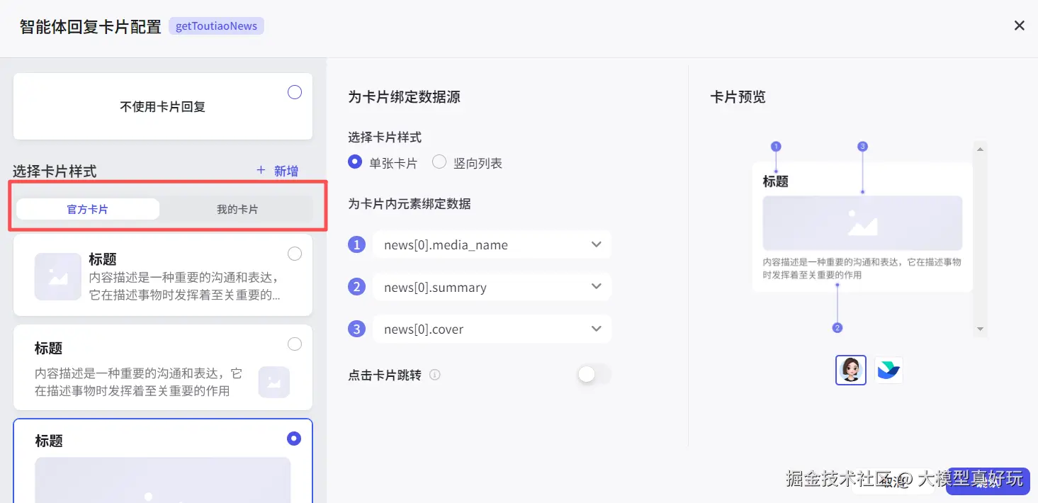 在卡片数据绑定界面有两种卡片绑定方式,开发者可以选择Coze提供的官方卡片模板,也可以选择创建自定义卡片。下面笔者将详细描述这两种方式的区别和配置方法: