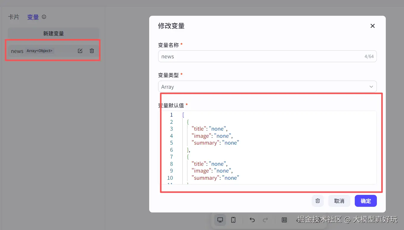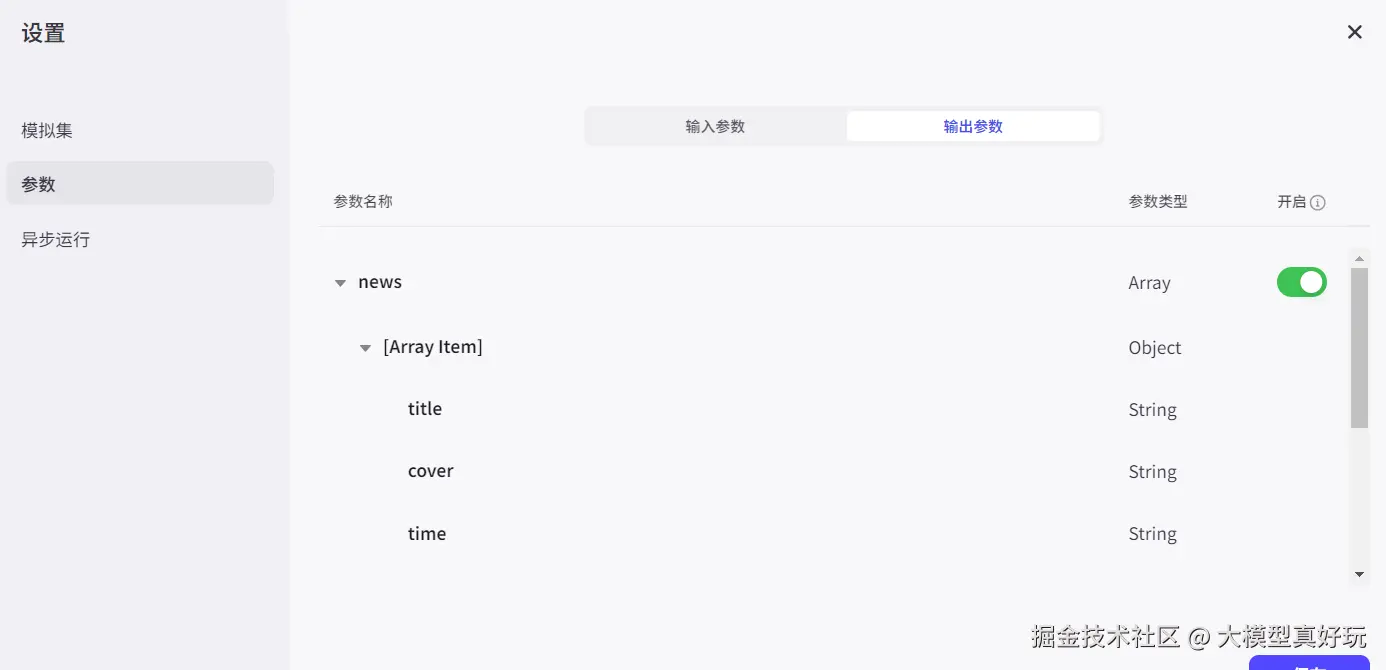 在绑定卡片前,首先需要了解插件会输出哪些参数。点击插件操作栏中的"编辑参数"图标(第四项),即可查看插件的输出数据结构。以NBA新闻智能体绑定的头条新闻插件为例,该插件返回的是一个新闻列表