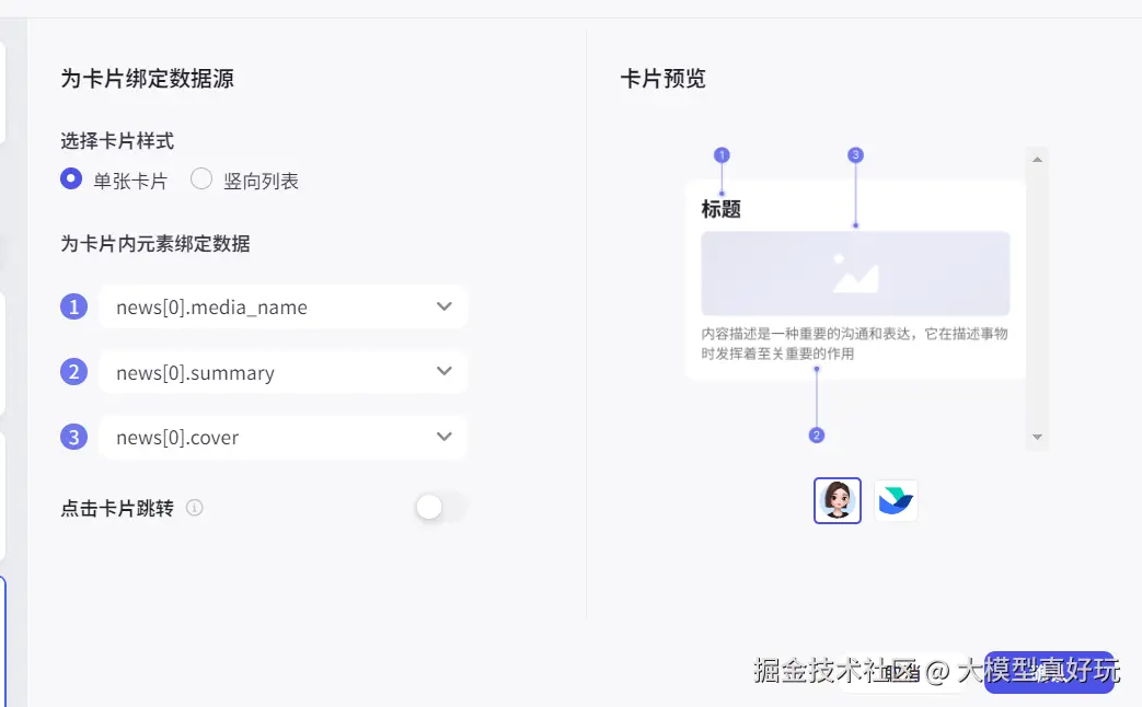 。 - 开启"点击卡片跳转"按钮,绑定跳转链接是新闻项的网页链接