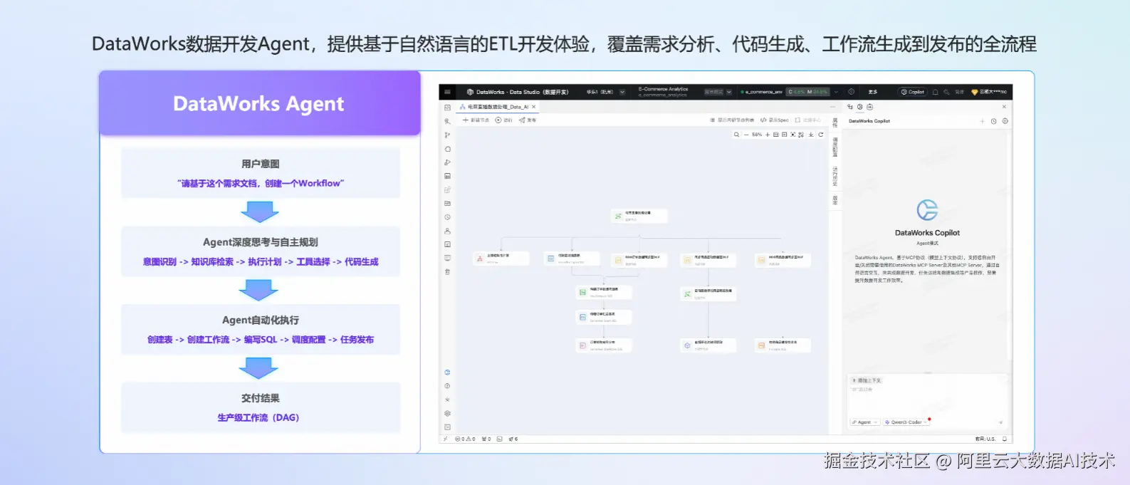 DataWorks 数据开发 Agent,可实现输入 ETL 需求文档,输出 ETL 工作流。用户只需输入自然语言需求或者需求描述文档,DataWorks Agent 可以理解用户意图,深度思考和自主制定规划,然后自动化执行规划,最终生成所需 ETL 工作流及任务代码。让 ETL 工程师从繁复的 SQL 开发和工具操作中解放出来,有更多时间来思考业务本身。