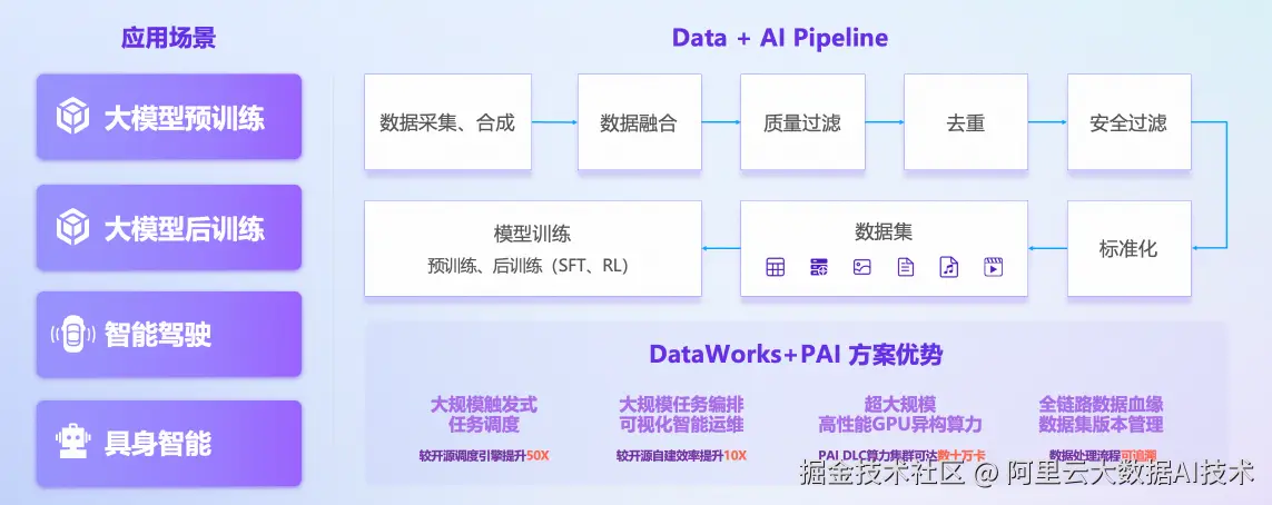 这一能力已在多个客户场景中验证价值。例如,在自动驾驶领域,某车企利用该机制实现了"数据标注 → 数据合成 → 数据融合 → 模型训练"的全自动闭环,通过 DataWorks 替代原有的自建 Airflow 方案,实现单日处理 clips 突破百万级,显著加速模型迭代节奏。