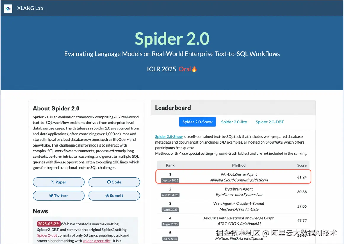 DataWorks Copilot的 NL2SQL 服务在被誉为"最接近真实企业场景"的权威基准测试 Spider 2.0 榜单中位列全球第一。