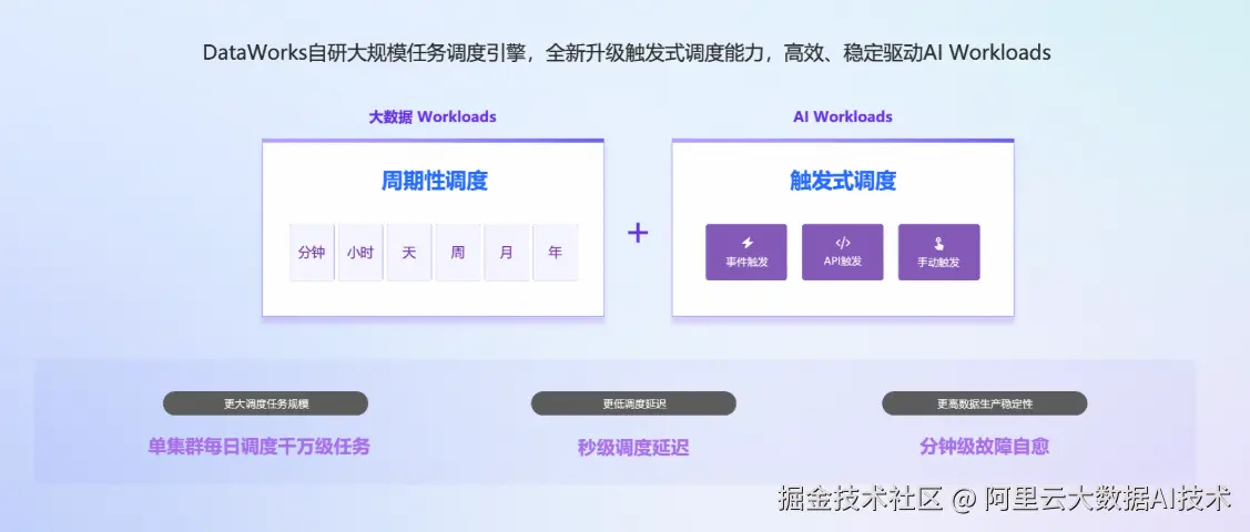 为此,DataWorks 对任务调度引擎进行了重大升级,全新升级了触发式调度的能力,用来高效稳定的驱动 AI 工作负载。