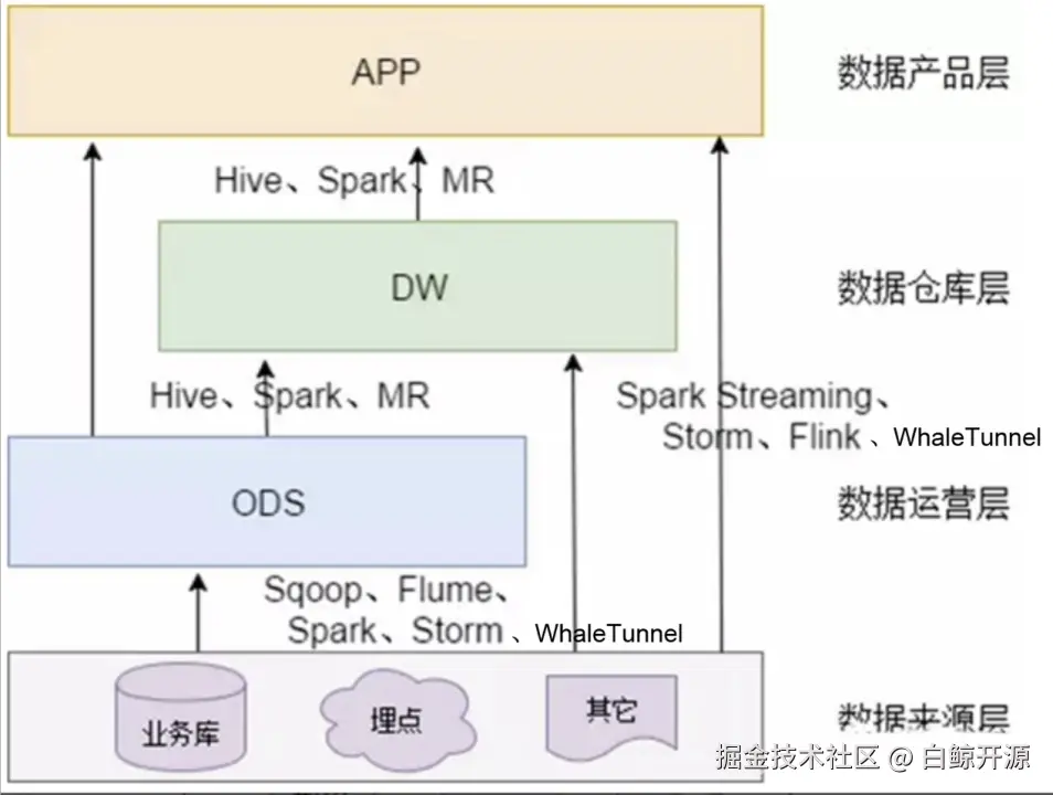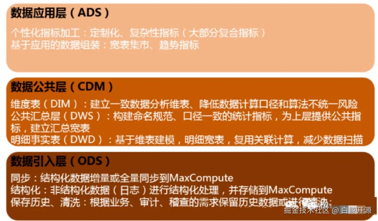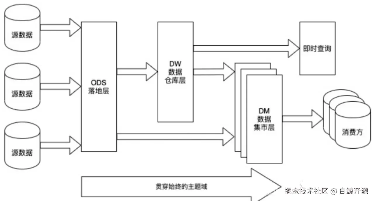 - 数据架构 通过顶层设计进行主题域划分,并采用分层体系(如ODS-DW-ADS)来组织数据流向和结构层次,确保数据管理的灵活性和适应性。