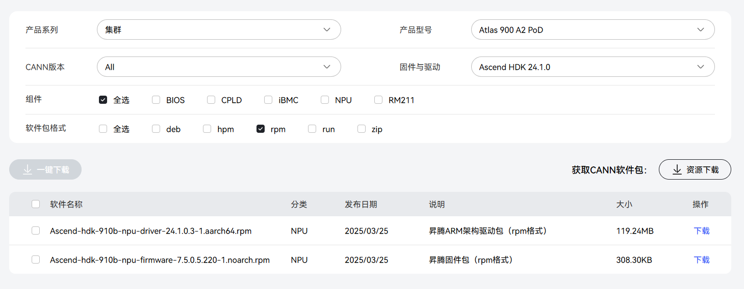 进入Ascend HDK软件页,选择对应版本下载。但会发现商业版无法下载,因此需要前往社区版下载对应的包: