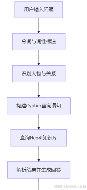 该功能实现了一个基于知识图谱的问答系统,专注于《红楼梦》人物关系的识别与回答。用户输入问题后,系统通过LTP进行分词和词性标注,识别出问题中的核心人物和关系词。随后,系统构建Cypher查询语句,查询Neo4j知识库中的相关关系数据,并将结果以友好的方式展示给用户。