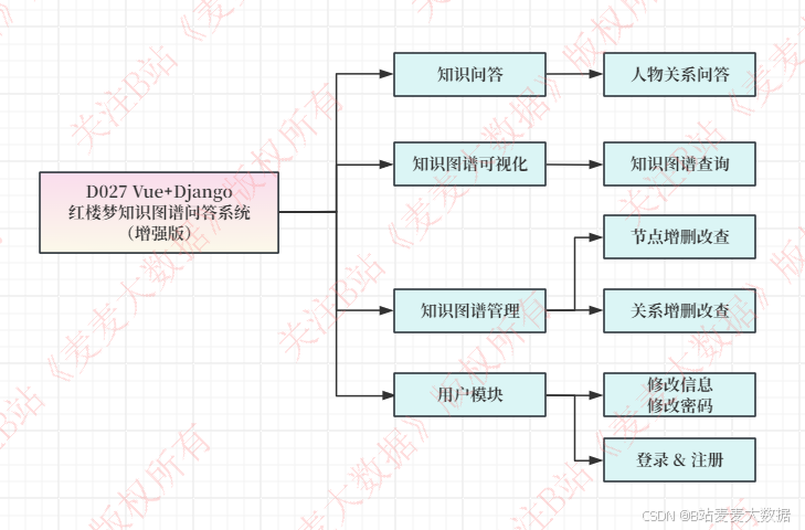 本系统是一个基于Vue+Django+Neo4j构建的红楼梦问答与知识图谱可视化系统,其核心功能围绕红楼梦知识的展示、问答和用户管理展开。主要包括:系统首页,用于展示系统概览和红楼梦相关背景信息;知识图谱模块,通过关系图谱可视化展示红楼梦人物间的关系,并支持查询功能;问答系统,支持用户通过自然语言提问,系统通过分词和词性标注分析,结合Neo4j数据库进行智能匹配,快速返回准确答案;仿真聊天功能,提供接近真人对话的交互体验,增强用户的使用乐趣;以及用户管理模块,包含登录、注册、实名认证、短信验证码修改密码等功能,为用户提供安全且个性化的使用体验