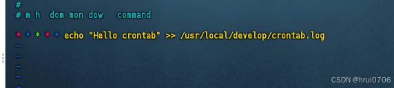 * * * * * echo "Hello crontab" >> /usr/local/develop/crontab.log