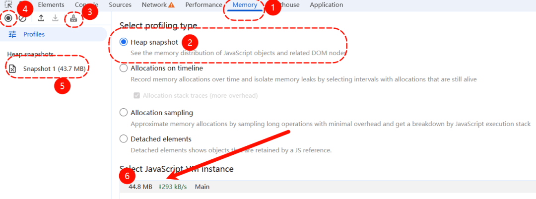 (⑥ 位置会展示堆内存的大小,能快速且直观地了解到整个页面的堆内存占用情况。)
