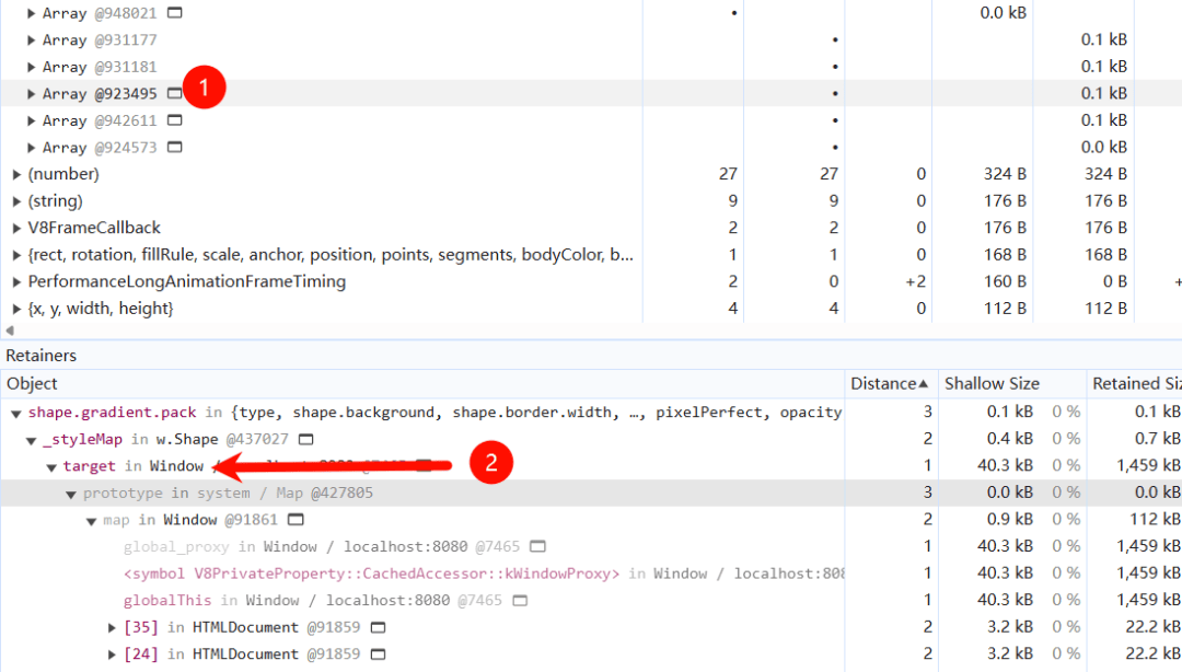 **■**追溯引用链:Retainers 树以被选中的对象为起点,逐层向上追溯,直到指向某个 GC 根节点(例如 (Global handles) 下的 window 对象)。开发者需要仔细检查这条链路上的每个节点。