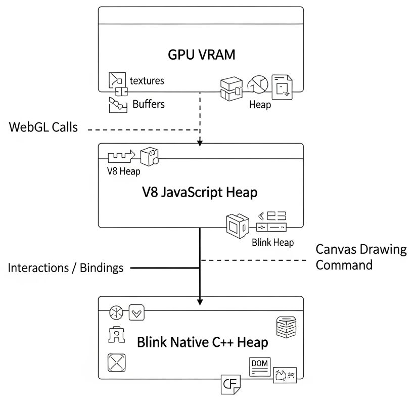 我们将分别对三个核心部分,系统性地分析每一层内存区域中常见的泄漏模式、底层成因,并介绍实用排查策略和解决方案。通过本篇分享,开发者将能够建立一个贯穿 GPU、JavaScript 引擎和浏览器渲染内核的整体内存心智模型,从而更有效地构建稳定、高效且无泄漏的 WebGL/Canvas 应用。