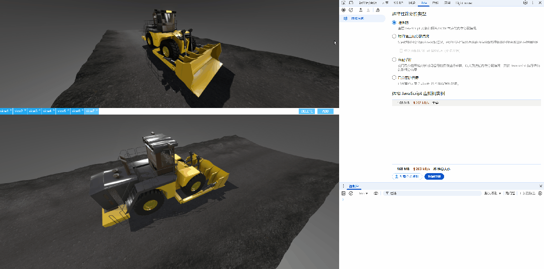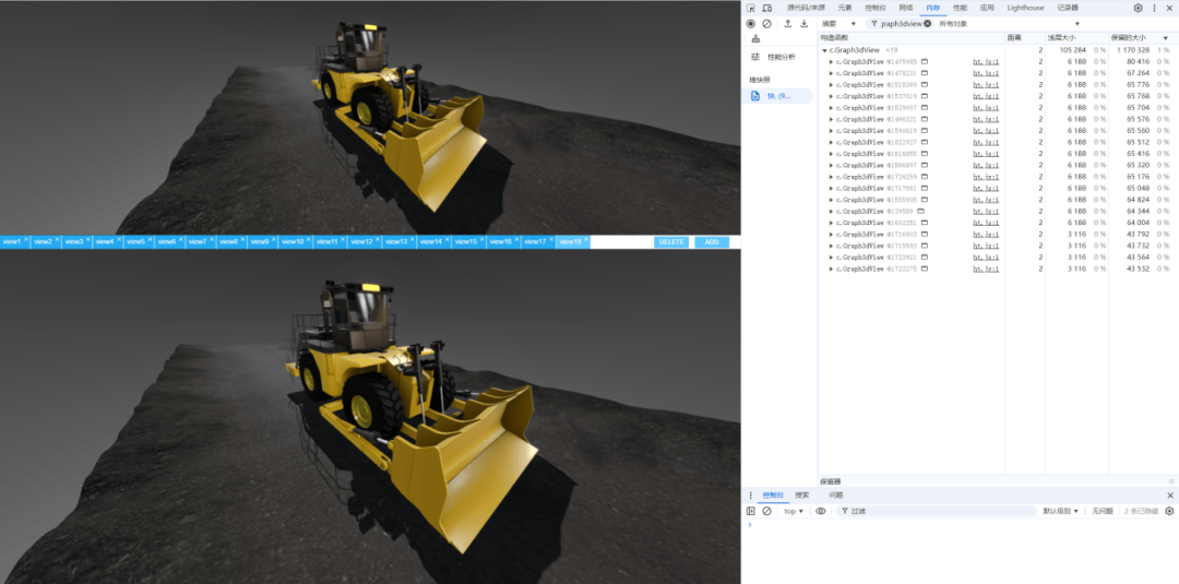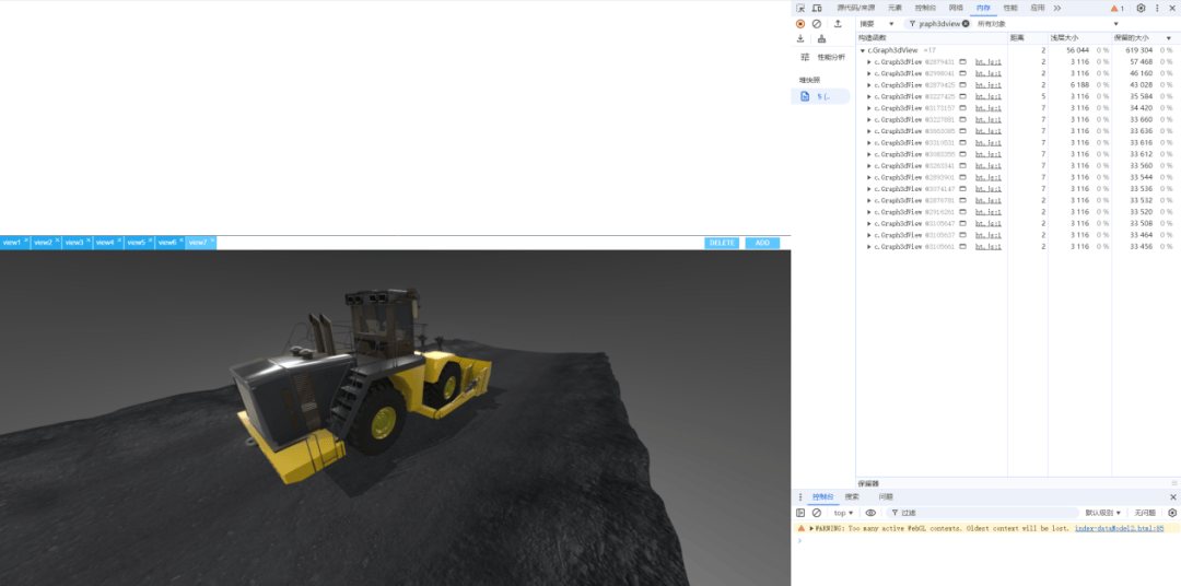 **■**删除最新的视图后,首个 WebGL 恢复,且删除后事件监听器占用的内存下降