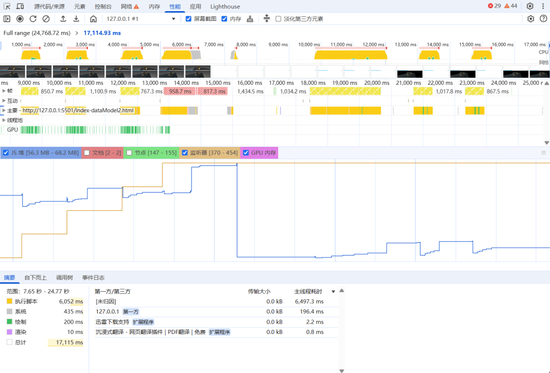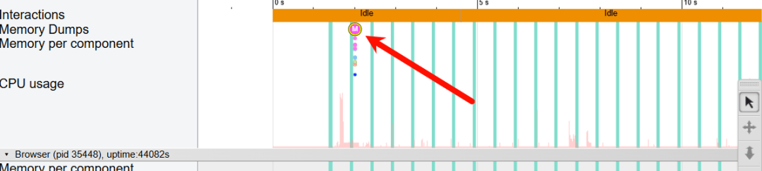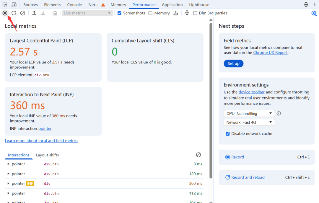 在实验操作前,我们可以打开 Chrome DevTools -> Performance (性能) 面板,并且点击面板中的录制按钮,记录整个实验过程,这能帮助我们在操作结束后,回溯并分析全程性能和内存的变化情况。
