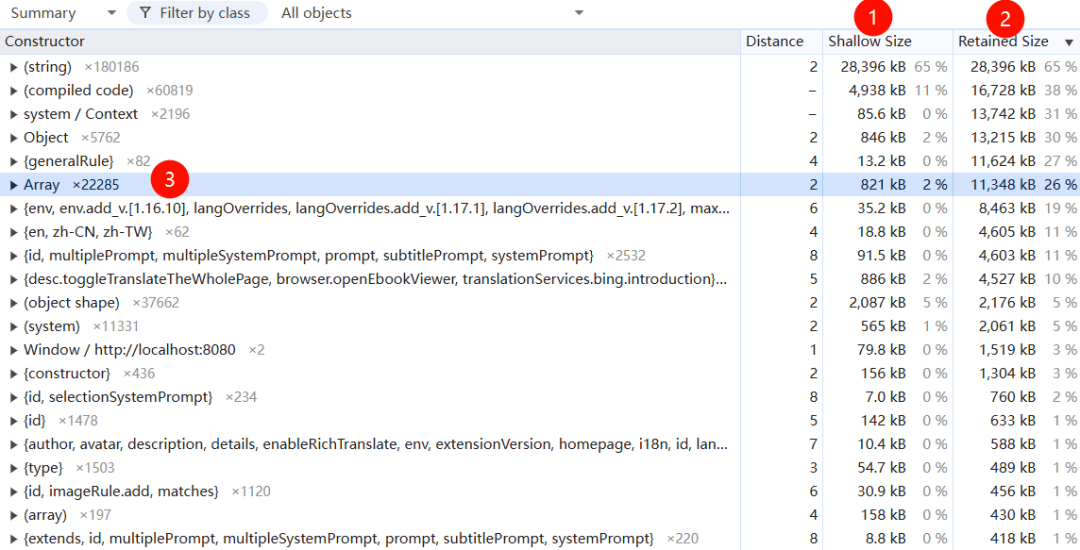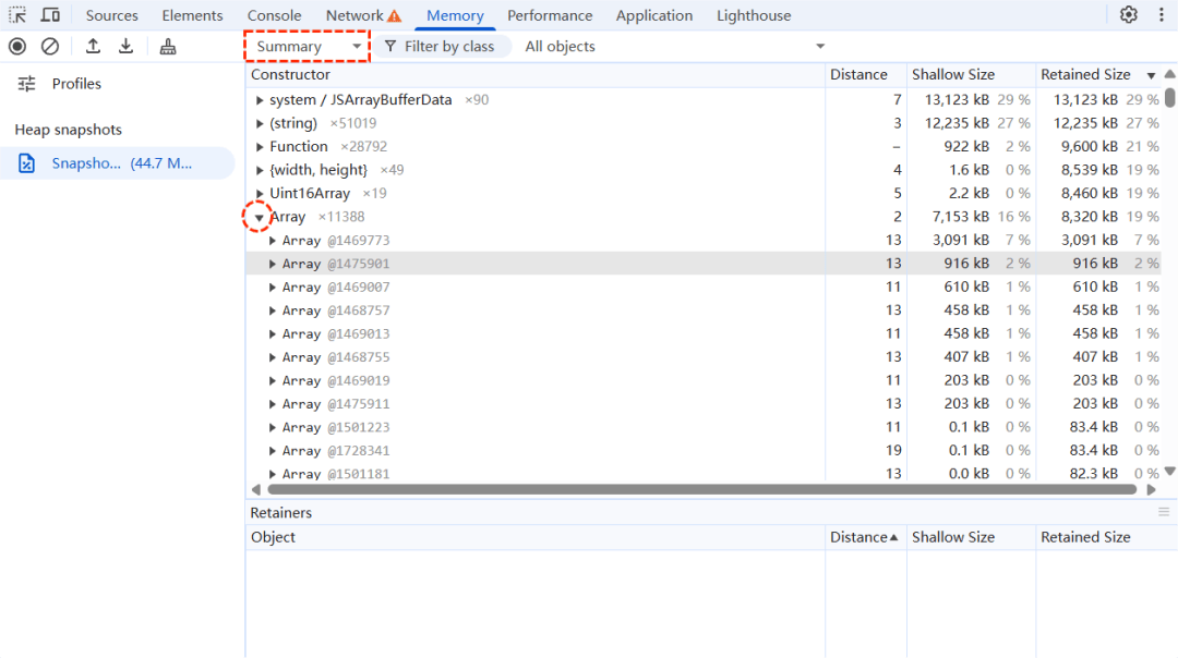 在上图所示的摘要中,每一项都支持展开,展开后可以看到对象的完整引用链。摘要面板适合的运用场景:当单次 Profile 已显示出大量的内存占用时,可先按 Retained Size 对列表进行排序,快速定位到占据了过高的内存的项,展开其中的可疑目标并一路追溯,直到找到根源 ------ 通常是挂载到全局 windows 对象上的变量,或被闭包捕获的变量。