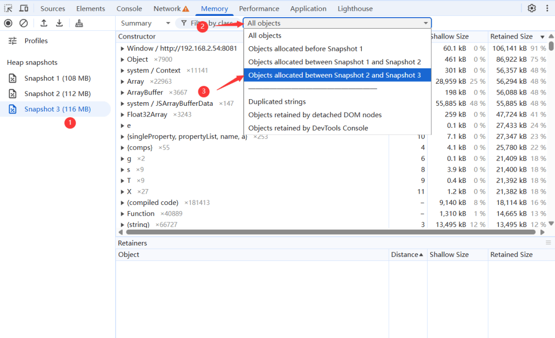 在完成以上的操作步骤后,选择第三个快照,并在顶部的视图选择器中(下图 ②),将视图模式从 Summary 切换为 Comparison,比较对象选择为快照 2(下图 ③)。现在视图只会显示快照 2 和快照 3 之间发生变化的对象。操作后需要关注以下内容: