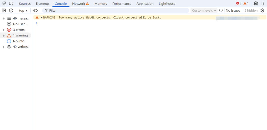 当 WebGL Context 超出限制,浏览器会采取强制措施:丢弃"最近最少使用"的那个 WebGL 上下文,并在控制台输出一条警告,如:"WARNING: Too many active WebGL contexts. Oldest context will be lost."(警告:活动 WebGL 上下文过多。最旧的上下文将被丢弃。)。对于那些未预料到此行为的应用而言,这可能导致灾难性的渲染失败,且问题难以追踪。