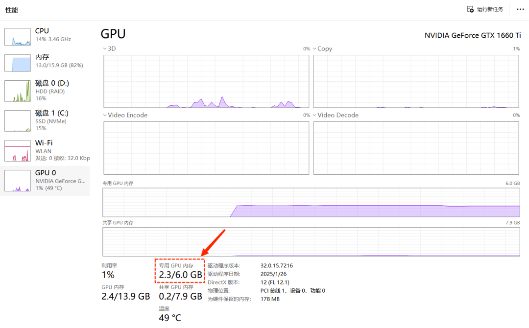 查看这类资源占用,通常需要观察系统显卡的显存使用情况。以 Windows 系统为例,可以通过:「任务管理器 → 性能 → GPU → 专用 GPU 内存」这一路径,直观地看到显存占用的变化趋势。以一个 6G 显存的 GPU 为例,尽量将显存占用控制在合理范围(譬如 5G 以内,避免超过 5.5G),否则一旦超标,系统可能会强制回收显存资源。