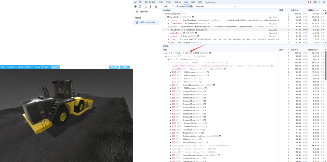 第一次实验,页面上有 19 个 Graph3dView,在内存中看到有 19 个 Graph3dView 对象,而第二次页面上仅有 7 个 Graph3dView,但是内存中有 17 个 Graph3dView 对象。这就说明了第二次的 Graph3dView 并没有被正确垃圾回收,这也就导致了即使移除了一个 Graph3dView,第一个场景也并不会恢复。打开其中一个 Graph3dView 可以看到,Graph3dView 与 window.dataModel 存在引用关系导致的。