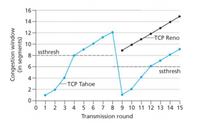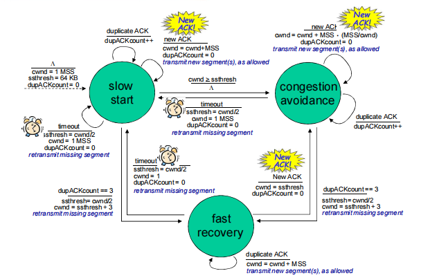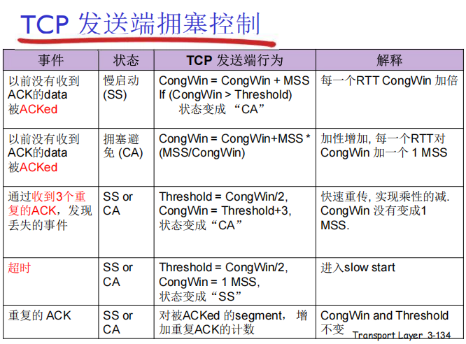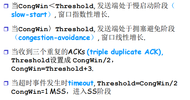 1 MSS,进入慢启动(SS)阶段 ;之后每个 RTT倍增,直到增长到 超时前 CongWin 的一半,再进入拥塞避免(CA)阶段。 - 3 次重复 ACK(轻微拥塞) :CongWin 直接降至 原窗口的一半,直接进入拥塞避免(CA)阶段。