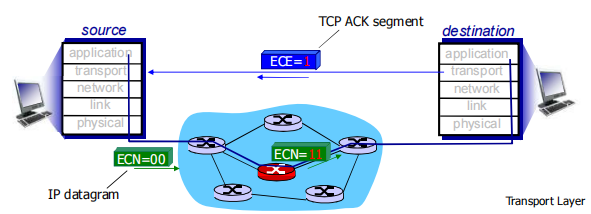 - 简单比特标记:用一个比特(如 SNA、DECbit、TCP/IP 的 ECN、ATM 机制)指示链路是否拥塞;