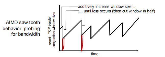 - 拥塞避免(CA)阶段 :每个 RTT,CongWin 线性增长,稳定速率以避免过度拥塞。