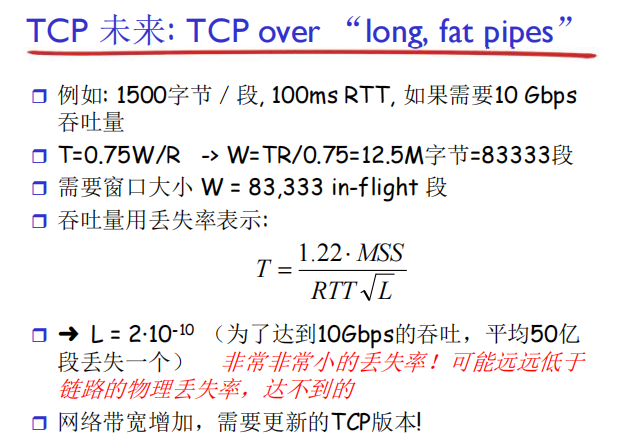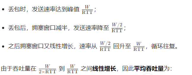 针对长存活期的 TCP 连接,忽略 超时事件后的慢启动阶段。假设在连接持续期间,往返时间(RTT) 和丢包时的拥塞窗口大小(W) 几乎不变。