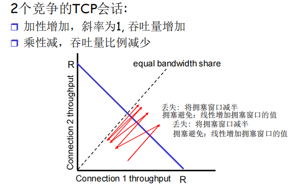 - 当两个连接的总吞吐量小于链路带宽 R 时,触发拥塞避免的 加性增, 两个连接的拥塞窗口以相同的线性斜率增长,总吞吐量沿 45度线增长,直到总吞吐量超过 R,引发丢包。