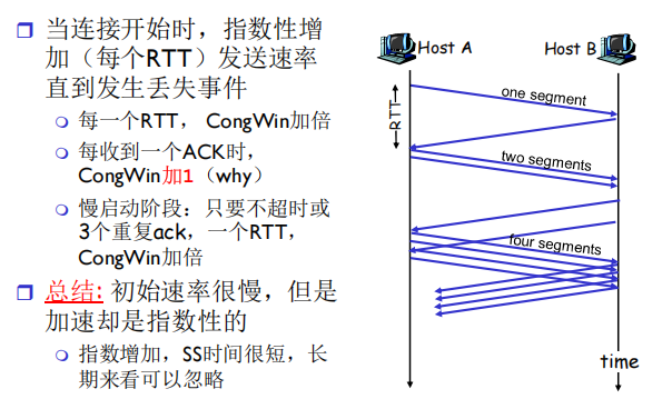 - 慢启动(SS)阶段 :每个 RTT,CongWin 指数级倍增,快速探测网络的承载上限。