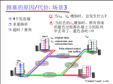 λ_out趋近于 0------ 这体现了拥塞的不公平性**(某条流的过度发送会 "饿死" 其他流),以及**重传 - 拥塞 - 更重传的恶性循环。