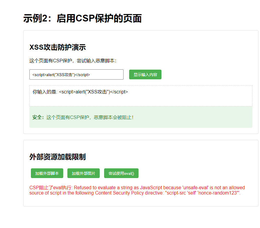 resultDiv.innerHTML = '<p style="color:red">CSP阻止了eval执行: ' + e.message + '</p>';