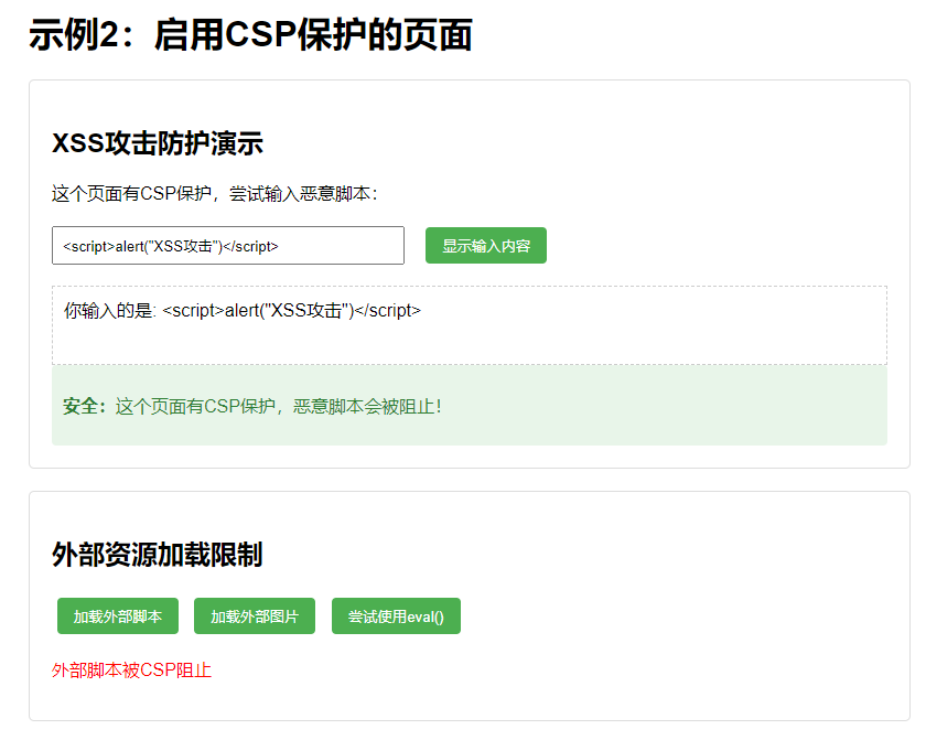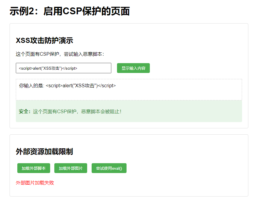 resultDiv.innerHTML = '<p style="color:red">外部脚本被CSP阻止</p>';